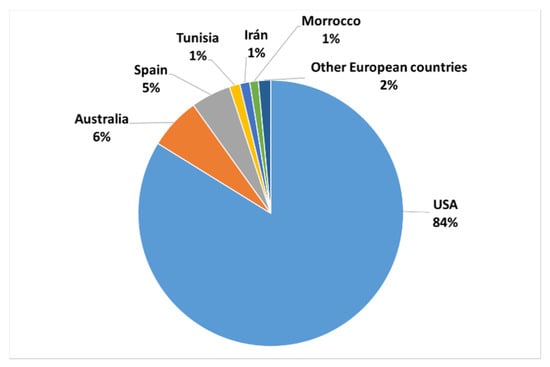 Almond shell is a type of biomass that is obtained from the cultivation of the almond. Almond cultivation is spread in many regions of the world, being the main producer the United States, followed at a great distance by Australia, Spain, Tunisia, Iran, and Morocco (Figure 1). These countries are joined by Greece, Turkey, and Italy, which complete the list of other European producers, according to data presented at the 37th International Congress on Nuts [4].