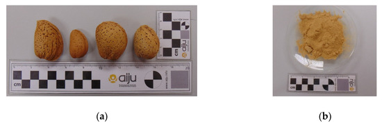 Almond shells represent around 65–80% of the total weight of the fruit [5], so with only the Spanish production of almonds, in the 2018/2019 campaign, there were between 205,000 and 250,000 tons of shells. There are a huge range of varieties of almonds and they can be distinguished according to their taste, use, flowering time, hardness shell, etc. Traditionally, the use of almond shells has been as food for animal husbandry or for obtaining energy from biomass cogeneration [6,7]. However, almond shells are an increasingly abundant waste product, and their high availability has sparked great interest in using this by-product as an absorbent for heavy metals and dyes, compost, production of active carbons, and production of xylo-oligosaccharides [8,9].