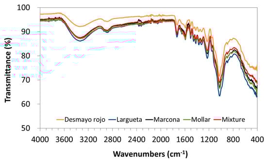 Fourier transform infrared spectroscopy (FT-IR) spectrums of almond shells varieties: Desmayo Rojo (orange), Largueta (blue), Marcona (black), Largueta (red), Mollar (green), mixture (red).