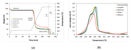 Thermogravimetric analysis (TGA) was used to determine the content of fixed carbon, volatile matter, humidity, and ash of lignocellulosic or carbonaceous materials [52]. Figure 4a represents the thermogravimetric curves for the different types of almond shells and the mixture of varieties, and Table 5 collects the results corresponding to the content of moisture, volatile matter, fixed carbon, and ash obtained. All samples show typical values for this type of lignocellulosic biomass, with a low amount of fixed carbon and a large amount of volatile matter. In turn, it is evident that the Molar, Largueta, and Desamayo Rojo varieties contain a lower ash content compared to Marcona and the mixture of varieties. Figure 4b shows the differential thermogravimetric curves (DTG) obtained in the decomposition temperature range of volatile matter. As observed, the five samples show differences in the decomposition profiles, evidencing the differences in their composition.
