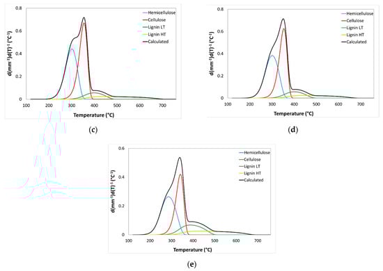 In addition, this technique is used to study the decomposition of the different components of lignocellulosic biomass—hemicelluloses, cellulose, and lignin [2,40]—and determine the kinetic parameters, such as activation energy (Ea), pre-exponential factor (K0), and pyrolysis heterogeneity factor (α). Table 6 shows the kinetic parameters obtained from the deconvolutions carried out on the DTG curves (Figure 5). These kinetic parameters are in agreement with those published [53,54,55,56,57]. From the area obtained in the integration of each curve associated with the decomposition of the biopolymers, the biocomposition of each of the samples is determined considering their carbonisation performance (Table 6). In the case of lignin decomposition, due to the high heterogeneity of the reaction, the calculation is carried out using two independent pyrolyses: the first one for lignin decomposes at low temperatures (LT) and the second one for lignin decomposes at high temperatures (HT), the second one being the most heterogeneous.