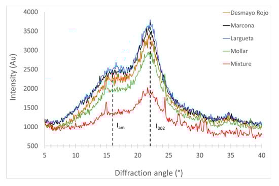 A high content of cellulose in natural fibres improves the mechanical properties due to higher crystallisation because cellulose is responsible for crystallisation. For composites, the application of a crystallinity index result could be considered as the factor for choosing that fibre during composite manufacturing. The XRD analysis determines the crystallinity index of natural fibres. Figure 6 shows the X-ray diffraction curves of different varieties of almond shell. As it can be seen in Table 7, the different varieties studied present some differences. The Largueta variety presents a crystallinity index of 33.8%, which is the highest of the varieties studied, while the mixture is 25.1%, the lowest out of all of them. The results obtained from almond shell varieties separately are in accordance with the obtained in previous studies [59]. The crystallisation values follow the same trend as in TGA analysis for the different varieties—that is, the commercial mixture with a lower cellulose content exhibits a lower crystalline index than Desmayo Rojo, Largueta, Marcona, and Mollar with higher cellulose content.