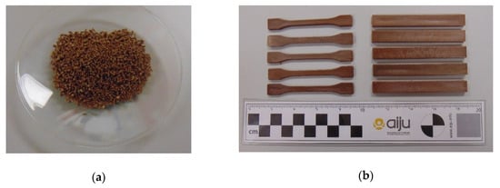 (a) Pellets of Mater-Bi DI01A with 30 wt% almond shell; (b) Injected samples of Mater-Bi DI01A with 30 wt% almond shell.