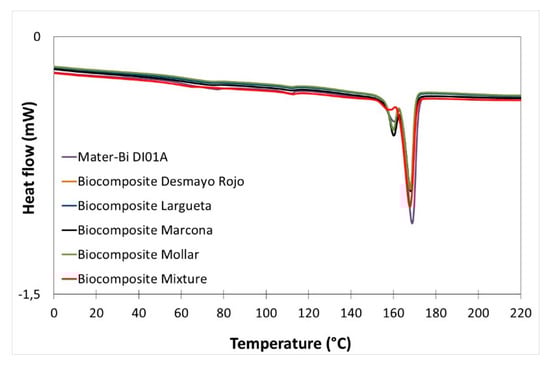 Comparative plot of the DSC curves starch-based polymer (Mater-Bi DI01A) and starch-based polymer/ASP biocomposites with different almond shell varieties.