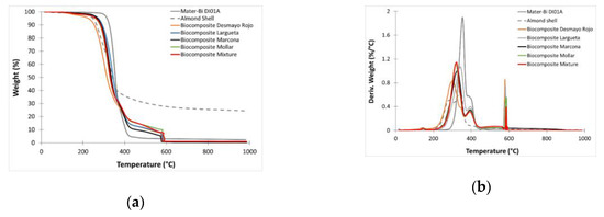 The biochemical composition of different almond shell varieties, the mixture, and the thermal stability (degradation/decomposition) of biocomposites developed were determined by thermogravimetric analysis (TGA) using a TA Instrument Q500 thermogravimetric analyser (TGA). Samples with an average weight comprised between 8 and 10 mg were placed in standard alumina crucibles of 70 µL.