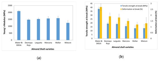 Tensile properties of as-received Mater-Bi DI01A and biocomposites with different almond shell varieties (a) Young’s modulus; (b) Tensile strength, and deformation at break.