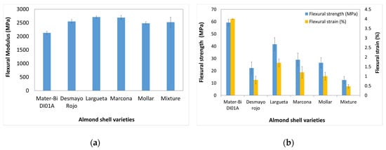 Flexural properties of as-received Mater-Bi DI01A material and biocomposites with different almond shell varieties: (a) Flexural modulus; (b) Flexural strength and flexural strain.
