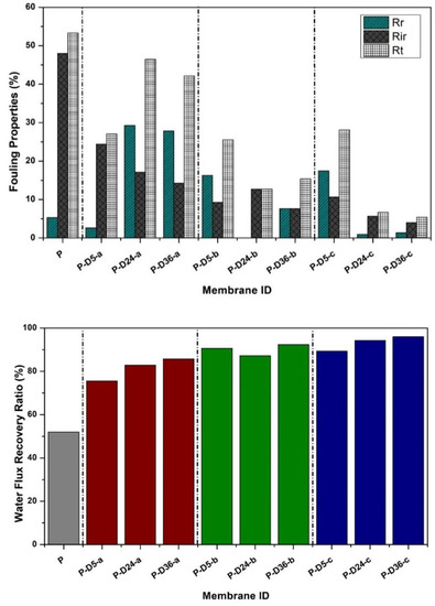 Figure 6 demonstrates that dopamine-modified membranes exhibit better antifouling properties than the pure PES membrane in terms of total flux loss due to fouling (Rt), recoverable flux (Rr), and non-recoverable flux (Rir). The pure PES membrane has denser pore characteristics as confirmed by the surface SEM images and high HA rejection results. The dense surface of the membrane causes the HA particle to easily accumulate on the membrane surface, resulting in a total flux loss (Rt) of 50.3%. Membrane cleaning could only recover 5.3% of those flux-loss due to the strong interactions between the hydrophobic HA particles and the surface of the PES membrane [28,32]. The modified membranes, especially those polymerized at shorter duration, suffer higher total flux loss than those with higher dopamine concentration and more extended dipping periods. This is because the presence of dopamine and PDA layer increases the membrane hydrophilicity (Figure 3), which improves the membrane cleaning effectivity as observed from the Rr and Rir data in Figure 6.