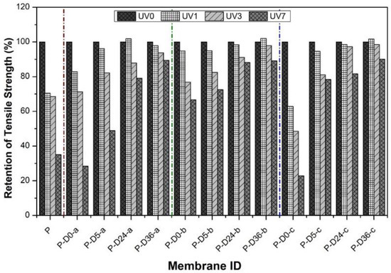 The tensile strength measurements were taken before and after UV radiation to investigate the effect of UV irradiation on the mechanical strength of all membranes. UV radiation was carried out for a week where the data of tensile strength were taken on the first day (24 h of radiation), the third day (72 h of radiation), and the seventh day (120 h of radiation). The measurement results are presented in Figure 9.