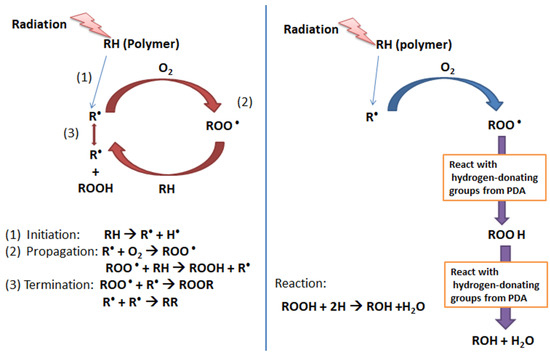 By adapting the schematic diagram of the stabilization mechanism using a phosphite antioxidant reported by Voigt and Todesco [43], Figure 11 presents the proposed mechanism of UV protection by PDA. In more detail, the mechanism of free radical scavenging by PDA is as follows: a polymer (RH), when exposed to radiation (UV light), will form radicals (R•). These radicals then react with O2 (existing in the environment) to generate peroxy radicals (ROO•). This peroxy radical is unstable and subtracts hydrogen atoms from the polymer chains (RH) to form hydroperoxides (ROOH) and more polymer radicals (R•). This is the stage where the photodegradation starts occurring and causes the scission of polymer chains, which yield to the change in chemical membrane components and morphological structure [44].