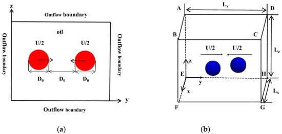 The coalescence of water droplets in the oil phase has been described by a few investigators. In the case of liquid–liquid two-phase droplet collision, the shape and size of the droplets, the distance between the droplets, the collision parameter and the droplet velocity will affect the droplet collision results []. Some experiments have been carried out on the collision and coalescence of dispersed droplets in oil. Using a microfluidic device, droplet collision experiments were conducted in flowing oil-in-water by Krebs et al. []. They showed that lower capillary number and oil phase viscosity would reduce droplet coalescence time. Huang et al. [] experimentally studied the effect of Alkali/Surfactant/Polymer (ASP) on the efficiency of oil-water separation and proved that the addition of demulsifier achieves a good treatment effect on oil-water separation. Moreover, coalescence time models of different water-oil mixing were obtained. Dudek et al. [] proposed a new microfluidic method for investigating the effects of droplet size and approach velocity of the colliding droplets. The results indicated that the larger the approach velocity of the droplet, the shorter the collision time and coalescence time. He et al. experimentally studied the coalescence and sedimentation behavior of iron droplets based on a mechanical stirring method. The results showed that although mechanical agitation increased the collision probability of the iron droplets, the non-center collision and coalescence of droplets became difficult due to the increase in the relative velocity of the iron droplets [].
