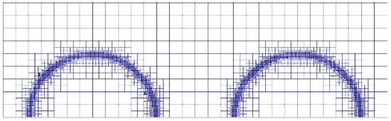 The adaptive mesh refinement (AMR) technology can locally refine the two-phase interface region in the computational domain, which reduces the calculation cost and improves the calculation accuracy of numerical simulation [,]. Maric et al. [] developed a dynamic local adaptive mesh refinement algorithm for unstructured meshes in OpenFOAM (OpenFOAM Foundation, OpenFOAM 5.0, Delaware, USA) to track the liquid-liquid interfaces in two-phase flow. In this paper, the hexahedral adaptive mesh solver interDyMFoam based on the OpenFOAM standard is used to track and locate the water-oil interface. Figure 3 shows the computational mesh generated by interDyMFoam.