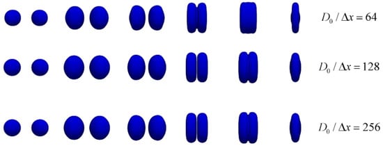 To study the effect of the initial droplet diameter (D0) on coalescence, three simulations were carried out with initial droplet diameters of 0.2 mm, 0.3 mm, and 0.4 mm at the same collision velocity. Figure 7 shows snapshots of the droplet coalescence of these simulations.