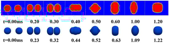 Numerical verification of water droplet collision in the oil phase: the simulation results of Yuan [] (top); the numerical simulation results of this model (bottom).