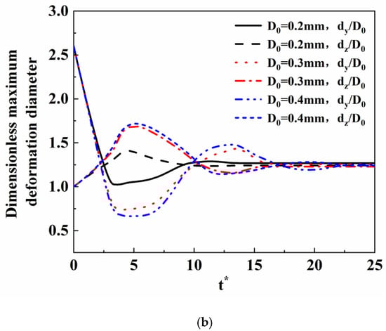Figure 8a shows the deformation parameters during the droplet collision, where dy is the maximum axial diameter and dz is the maximum radial diameter. In this paper, dimensionless maximum deformation parameters dy/D0 and dz/D0 are used to describe the droplet deformation. Figure 8b shows the evolution of the dimensionless maximum deformation diameter of three different initial droplet diameters with the dimensionless time.