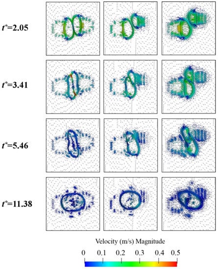 When the droplets approach each other, there is an increment of the pressure between them, and therefore the velocity of the droplet increases (t* = 2.05). Inside the droplet with B = 0.25, the velocity remains at around 0.1 m/s (t* = 3.41), while in the local region of the droplets contact, the droplet velocity increases to a value of 0.5 m/s due to the rapid increase in pressure in this region. For droplets with B = 0.5 and B = 0.75, due to the viscosity of the oil phase, the velocity of the droplets decreases at t* = 3.41. As the collision parameter increases, only a small part of the kinetic energy of the droplet is converted into surface energy, and the remaining kinetic energy is used for the droplet collision. Therefore, when t* = 5.46, the internal velocity of the droplet with B = 0.75 is the largest. In addition, it can be seen from Figure 10 that, when B = 0.75, the velocity vectors on both sides of the droplet are denser, and the streamlines explain the stretch deformation of the droplet in the coalescence deformation stage. According to the research by Jiang et al. [], in the process of the droplet recovering to a spherical shape, the internal pressure of the droplet increases under the action of surface tension. Therefore, the velocity inside the droplet flows toward the center of the droplet, Figure 10, t* = 11.38.