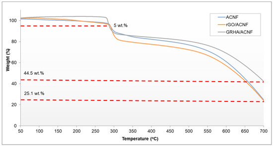 TGA thermogram of the samples. ACNF: activated carbon nanofibers, rGO: ACNF: activated carbon nanofibers, GRHA: graphene-derived rice husk ashes.