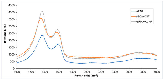 The D band was higher than the G band, indicating more disordered structures in the ACNFs (Figure 2). This result is supported with the “R-value”, or intensity ratio, of the samples. The smaller the “R-value”, the more ordered graphite crystallites are [34]. The R-values of the pristine ACNFs, rGO/ACNF, and GRHA/ACNF were 1.17, 1.40, and 3.17, respectively, which indicated that the addition of rGO or GRHA promoted the formation of more disordered or defective graphitic structures in the ACNFs. According to Liu and Wilcox (2011) [36], the gas adsorbates showed stronger binding interactions with the defective site on the surface of adsorbents as compared to the surface of perfect adsorbents.