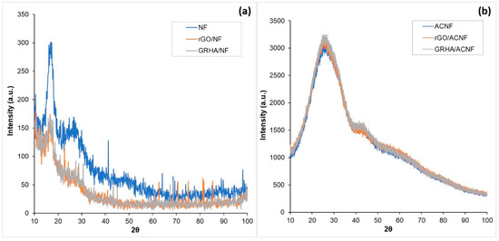 XRD spectra of pristine and composite nanofibers (a) prior to activation and (b) after activation. ACNF: activated carbon nanofibers, rGO: ACNF: activated carbon nanofibers, GRHA: graphene-derived rice husk ashes.