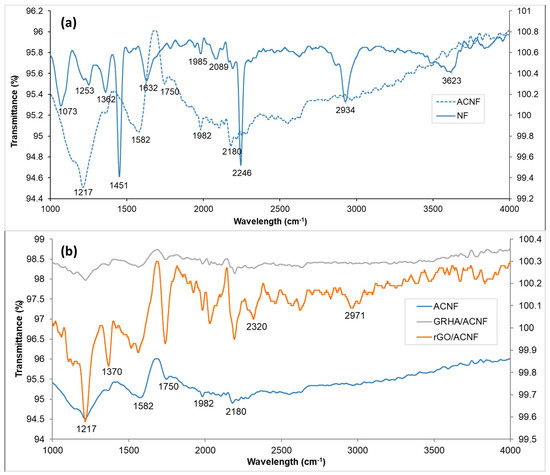 FTIR spectra of pristine and composite nanofibers (a) prior to activation and (b) after activation. ACNF: activated carbon nanofibers, rGO: ACNF: activated carbon nanofibers, GRHA: graphene-derived rice husk ashes.