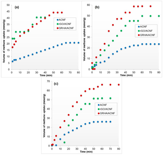 Figure 8 shows the CH4 adsorption performances of all ACNFs at different pressures. In Figure 8a, it can be seen that the GRHA/ACNF exhibits the highest CH4 adsorption capacity, of 44.32 mmol/g, followed by rGO/ACNF of 40.52 mmol/g and ACNF of 20.86 mmol/g at 4 bar. Meanwhile, Figure 8b,c exhibit the adsorption profile of CH4 at other pressures, which was 8 bar and 12 bar, respectively. With an increasing pressure, the CH4 adsorption capacity of all ACNF samples was gradually increased and reached a smooth value at equilibrium state. As expected, the adsorption performance of all ACNF samples showed similar trends as the one at lower pressure (4 bar), which was GRHA/ACNF>rGO/ACNF>ACNF.