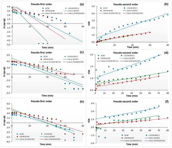 Figure 9 shows the adsorption kinetic of all ACNF samples based on pseudo-first- and pseudo-second-order kinetic models at different pressures. As can be seen, the pseudo-second-order kinetic model exhibited greater value of all the coefficient correlations (R2) than the pseudo-first-order kinetic model, which were 0.9262, 0.9685, and 0.9737 for ACNF, rGO/ACNF, and GRHA/ACNF, respectively, at adsorption pressure of 4 bar. Among the samples, GRHA/ACNF possessed the highest R2 value, of 0.9737. It suggests that the adsorption of CH4 towards ACNFs obeyed the pseudo-second-order kinetic models, indicating that the sorption kinetics of CH4 occurred on the microporous structure of ACNFs involved in the chemisorption [60]. This result is in good agreement with the N2 adsorption isotherm and SSA data. This finding was supported by a previous study conducted by Tang and co-workers (2007) [61], as they also found that the ACNFs-based adsorbents obeyed the pseudo-second-order kinetic model. Interestingly, at higher pressures, of 8 and 12 bar, all samples seemed to obey the pseudo-first-order kinetic model, with higher R2 value than pseudo-second-order kinetic model, as tabulated in Table 4. R2 values of GRHA/ACNF at 8 and 12 bars were 0.9369 and 0.8054, respectively. This is believed due to the occurrence of physical adsorption because of the formation of multilayers of CH4 molecules on the heterogeneous surface of the ACNFs at higher adsorption pressure.