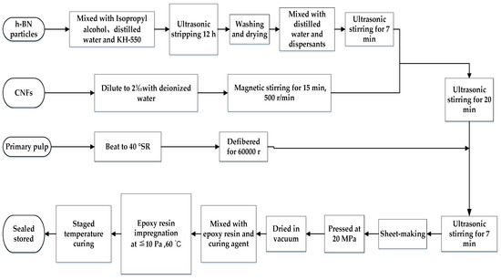 Flow chart of the process of creating epoxy resin-impregnated nano-hexagonal boron nitride (h-BN) + nano-cellulose fiber (CNF)-modified pressboard.