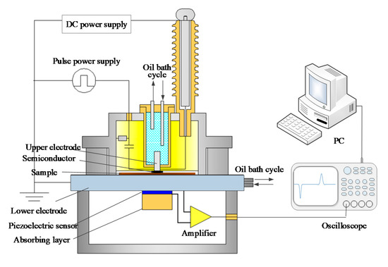 The pulsed electro-acoustic (PEA) technique was applied during the space charge test. The test field strength was 10 and 20 kV/mm, respectively, and a pulse field strength of 2 kV/mm was applied simultaneously. The test temperature was maintained at 298.15 K. The structure of the PEA test system is illustrated in Figure 2.