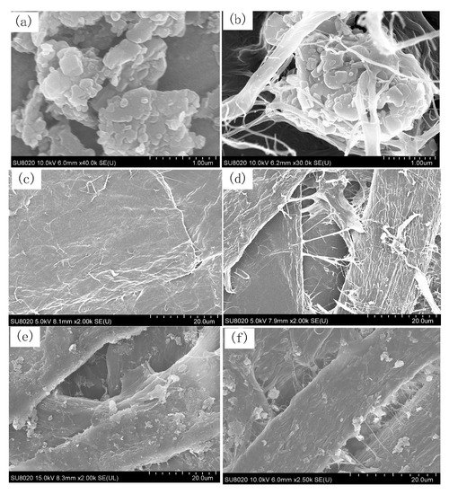 SEM image: (a) nano-h-BN sheets, (b) CNF-modified nano-h-BN, (c) unmodified pressboard, (d) CNF-modified pressboard, (e) h-BN-modified pressboard, and (f) h-BN + CNF-modified pressboard.