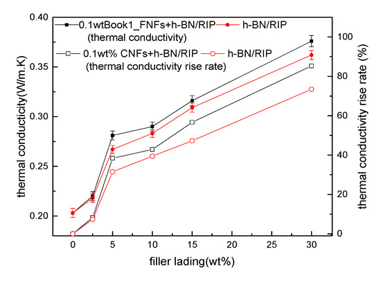 The thermal conductivity and rate of rise in thermal conductivity of 0–30 wt % h-BN + 0.1 wt % CNF/RIP and 0–30 wt % h-BN/RIP are presented in Figure 4. When the h-BN content is the same, the thermal conductivity of 0.1 wt % CNFs/RIP is slightly higher than that of h-BN/RIP. The thermal conductivity of 0–30 wt % h-BN + 0.1 wt % CNF/RIP and 0–30 wt % h-BN/RIP increased from 0.203 W/m.K to 0.376 W/m.K and 0.362 W/m.K, respectively. The higher the content of h-BN, the higher the thermal conductivity. The rate of rise in thermal conductivity of 30 wt % h-BN + 0.1 wt % CNFs/RIP and 30 wt % h-BN/RIP reached 85.2% and 73.4% respectively.