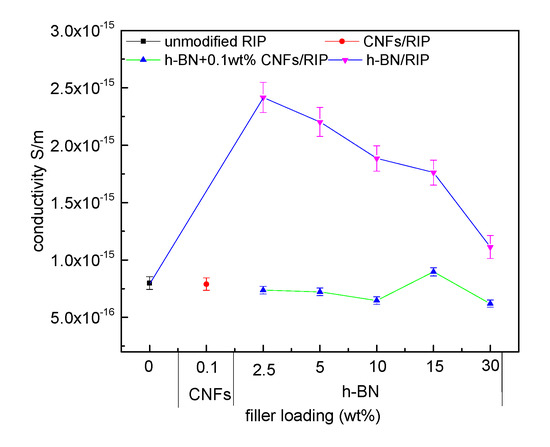 DC conductivity of unmodified RIP, CNF/RIP, h-BN/RIP, and h-BN/0.1 wt % CNF/RIP at 10 kV/mm.