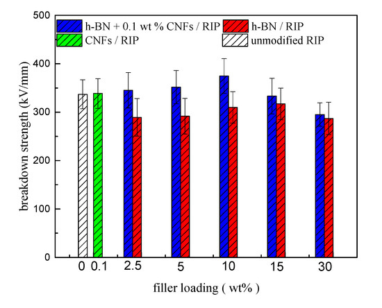 - CNF/RIP and h-BN/RIP did not increase the breakdown strength of RIP; however, they did increase the breakdown strength of 2.5–10 wt % h-BN + 0.1 wt % CNF/RIP. h-BN and CNFs were synergetic.