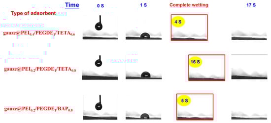 Figure 1 shows the images of the dynamic contact angle test, revealing the time required for the complete wetting of water droplets on various polymer-coated gauze. All samples are hydrophilic. The water droplet penetrated the adsorbents (complete wetting) within a short period of time. The complete wetting time for different membranes gauze@PEI0.4/PEGDE1/TETA0.6, gauze@PEI0.2/PEGDE1/TETA0.8, and gauze@PEI0.2/PEGDE1/BAP0.8 is 4, 16, and 5 s, respectively.