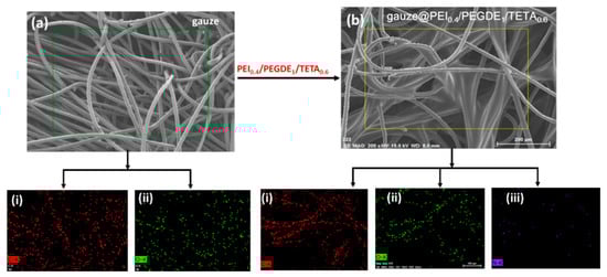 FESEM images of (a) pristine gauze and (b) gauze@PEI0.4/PEGDE1/TETA0.6. Elemental C, O, and N mapping of the pristine gauze.