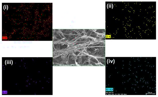 SEM image of Ni2+ adsorbed gauze@PEI0.4/PEGDE1/TETA0.6, and (i) C, (ii) O, (iii) N, and (iv) Ni2+ mapping.