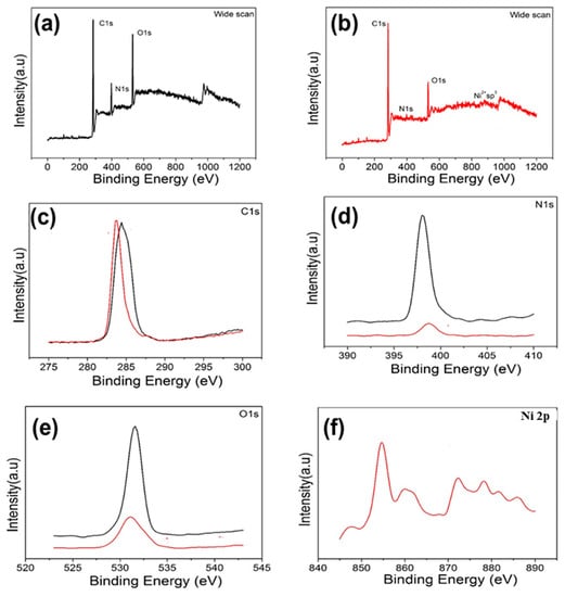Wide-scan XPS spectra of (a) gauze@PEI0.4/PEGDE1/TETA0.6 and (b) Ni2+ adsorbed gauze@PEI0.4/PEGDE1/TETA0.6. XPS spectra of (c) C 1s; (d) N 1s; (e) O 1s, and (f) Ni 2p regions in gauze@PEI0.4/PEGDE1/TETA0.6 (black line) and gauze@PEI0.4/PEGDE1/TETA0.6 after Ni2+ adsorption (red line).