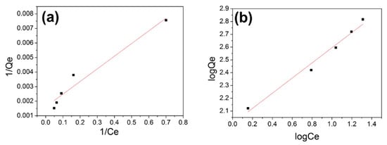 Adsorption isotherms of gauze@PEI0.4/PEGDE1/TETA0.6 based on (a) the Langmuir isotherm model and (b) the Freundlich isotherm model.