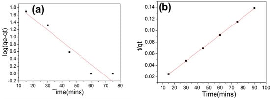 Adsorption kinetics of Ni2+ ions on gauze@PEI0.4/PEGDE1/TETA0.6 fitted in (a) pseudo first-order model and (b) pseudo second-order model.