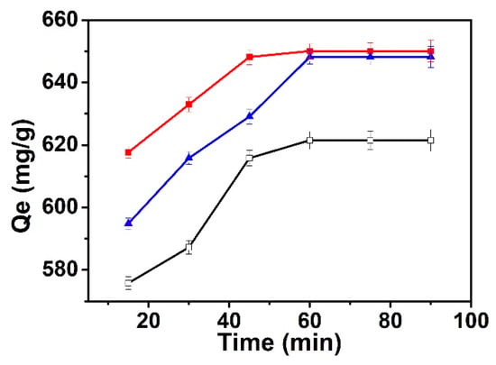 Surprisingly, as seen in Figure 8, gauze@PEI0.4/PEGDE1/TETA0.6 exhibited the best adsorption capacity among all three immobilized adsorbents. Hence gauze@PEI0.4/PEGDE1/TETA0.6 is chosen to be used throughout the rest of the study. Nevertheless, the adsorption capacity of all three immobilized adsorbents increases with time and remains constant after 80 min as seen in Figure 8. Thus, the reaction time for the rest of the experiments was carried out in a constant amount of time, 80 min. It is worth noting that equilibrium can be reached within such a short period of contact time, suggesting that the adsorbents show an excellent affinity towards Ni2+ ions.