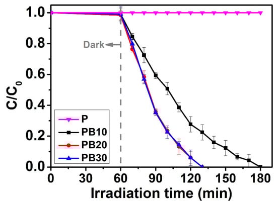 The RhB dye was selected to survey the photocatalytic activity of the polymer-modified gauze, and polymer/BiOBr-modified gauze samples (PB10, PB20, PB30). Photodegradation curves are demonstrated in Figure 11. The control experiment was performed without adding any BiOBr photocatalyst on polymer-modified gauze (P) to realize the decolorization nature of P under the irradiation of light. From the blank experiment, it is revealed that RhB was not decolorized by P under the light irradiation. The decoration of BiOBr on the adsorbent layer introduces the photocatalytic activity. It takes 120 min for 100% degradation of RhB by PB10. PB20 and PB30 showed excellent photocatalytic activity with 100% degradation of RhB over 70 min than that of PB10 (78% degradation). PB30 with more BiOBr did not show better activity than PB20 with fewer BiOBr. As demonstrated in Figure 9d, agglomeration of the BiOBr particles was found on the fiber surface. The effective surface active area of BiOBr cannot increase because of the agglomeration. This may be the reason why PB20 and PB30 showed similar photocatalytic activity.