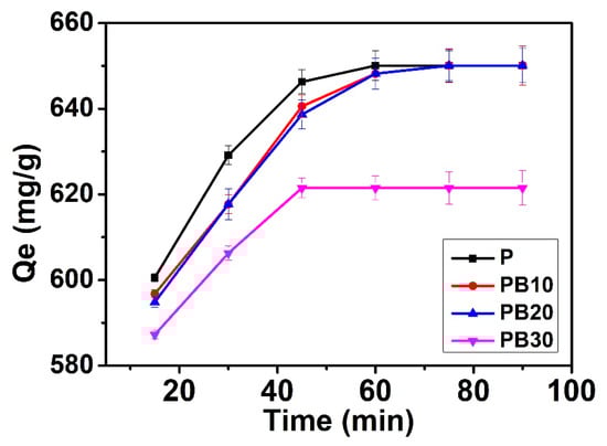 Adsorption capacity towards Ni2+ of polymer-modified gauze (P), and polymer/BiOBr-modified gauze samples (PB10, PB20, PB30) are shown in Figure 12. The control experiment was performed without adding any BiOBr photocatalyst on polymer-modified gauze (P) to realize the Ni2+ adsorption capacity of P. From the blank experiment, it is revealed that P possesses excellent adsorption capacity of 650 mg g−1 for Ni2+ ions. After the decoration of BiOBr on the adsorbent layer, the area of exposed polymeric adsorbent (PEI0.4/PEGDE1/TETA0.6) decreased. The results in Figure 12 showed that PB10 and PB20 samples had similar Ni2+ adsorption capacity (650 mg g−1) as P. However, the Ni2+ adsorption capacity of PB30 decreased to 620 mg g−1. The decreased area of exposed polymeric adsorbent may be the reason for the decreased adsorption capacity. Considering the compromise between photocatalytic activity and Ni2+ adsorption capacity, PB20 is the optimized dual-functional polymer/BiOBr-modified gauze membrane.