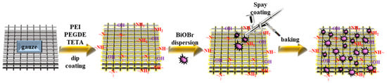The prepared BiOBr suspension (5 wt% in ethanol) was loaded in an airbrush (Sparmax DH-103) with a 0.3-mm nozzle. Then, the suspension was spray-coated on the surface of the gauze@ adsorbent substrates (4 cm × 4 cm) layer by layer. Three samples (PB10, PB20, PB30) were prepared by changing the time for spray coating (10, 20, 30 s). The samples were denoted as PBX. P means the polymer-modified gauze sample (gauze@PEI0.4/PEGDE1/TETA0.6). B indicates BiOBr photocatalyst. X indicates the time for spray coating. The process for the preparation of polymer/BiOBr-modified gauze (Section 2.3 and Section 2.4) is demonstrated in Scheme 1.