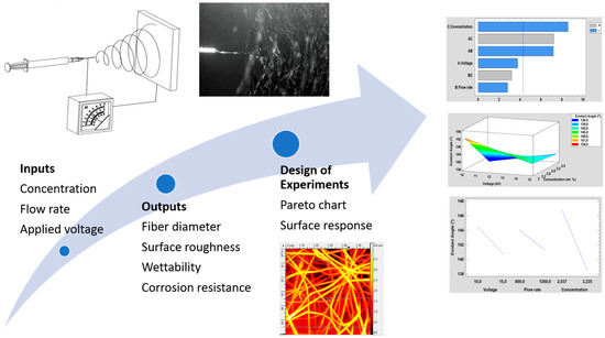 The roughening hydrophobic polymeric materials by nature through electrospinning introduces a highly rough structure as well as low surface energy materials based on nanofibrous mats [23]. In the electrospinning, an electrostatic force is used to obtain electrically charged polymeric jet, which overcomes the surface tension of the polymeric solution. As a result, elongated fibers are accelerated from the capillary tip and deposited onto the collector with corresponding evaporation of the solvent [24,25]. Multiple parameters have to be controlled such as the intrinsic polymeric precursor properties (concentration, molecular weight, viscosity, surface tension, nature of solvent), the operational condition parameters (applied voltage, flow rate, distance of tip to collector), and the environmental conditions (relative humidity, temperature) [26,27]. Another aspect to note is that the surface morphology derived from the electrospun fibers with this specific superhydrophobic behavior can be also implemented for the design of anticorrosive surfaces [28,29]. In this work, polyvinyl chloride (PVC) has been selected for the development of the electrospun fiber mats for being a polymer with a hydrophobic behavior by nature with good anticorrosion properties. The novelty of this work is that, by an adequate control of the input parameters in the electrospinning process such as solution concentration, applied voltage and flow rate makes the fabrication of a desired morphological structure possible. In addition, the use of a design of experiments (DoE) has been conducted in order to define the most representative factors which directly affects to the surface morphology (average fiber diameter, roughness), wettability, and corrosion resistance. The experimental results and the surface responses derived from DoE corroborate that solution concentration has been shown to be the most significant factor in the wettability, enabling the fabrication of hierarchical fiber/bead composites with an intrinsic superhydrophobic behavior, whereas the operational process parameters (applied voltage and flow rate) have shown a much greater effect compared to the solution parameter in the resultant corrosion resistance of the electrospun PVC fibers. Finally, this is the first time that design of experiments (DoE) statistical methodology has been implemented over the electrospinning process of PVC electrospun fibers for the optimization of superhydrophobic or anticorrosive surfaces with the aim to obtain an adequate surface morphology in a certain industrial or engineering application.