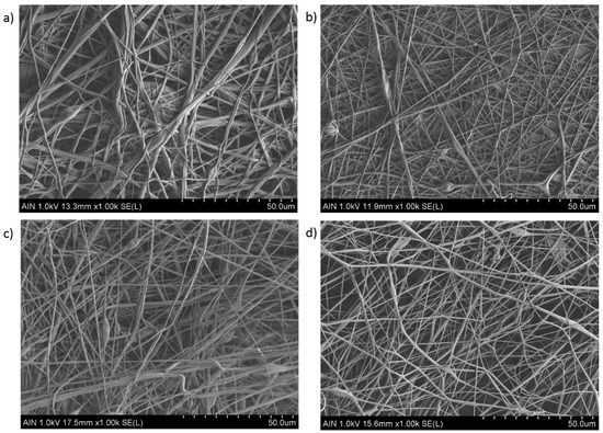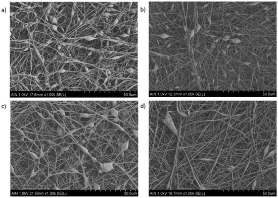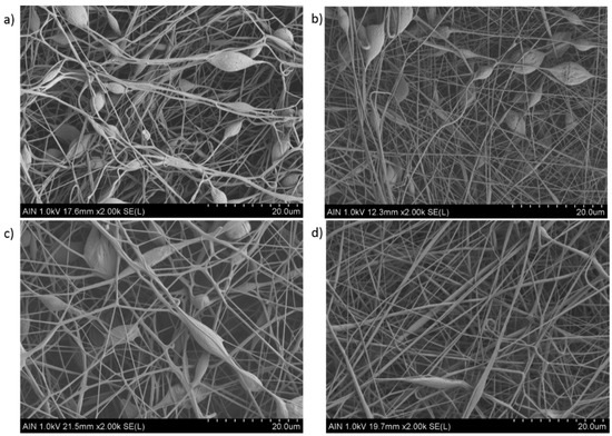 In this work, the experimental results obtained by this study for variable PVC concentration are in concordance with literature, as it can be appreciated in the SEM images related to Figure 2 and Figure 3, respectively. In Figure 2, by increasing the PVC solution at a fixed concentration (15 wt %) results in the formation of electrospun fiber mats which are nearly bead-free (Figure 2a–c) or even free (Figure 2d) in comparison with the SEM images in Figure 3 (10 wt %), showing a high density of beaded-fibers. Due to this, it can be confirmed that as a function of the initial polymeric solution, the resultant surface can be perfectly controlled with the desired morphological features. In addition, the effect of applying a higher voltage (15 KV) results in the formation of thinner electrospun fibers (Sample 2 and 4) in comparison with the samples with a lower voltage (10 KV) which corresponds to the Samples 1 and 3, respectively. Previous works have demonstrated that a high voltage allows stretching forces capable of promoting the formation of distributed uniform fibers [40,41] and the effect of increasing the applied voltage produces narrower fibers due to the production of a higher electrostatic repulsive force on the fluid jet [42,43]. Nevertheless, taking into account other works, an adequate selection of the voltage depends on the system used such as type of solvent, polymer concentration, and the distance of the tip to the collector [44,45]. According to the tip-to-collector distance, generally a longer distance yields the formation of thinner electrospun fibers because it is given enough time for stretching of the jet and delayed flight time [46], although it has been also observed that too near or too far distances makes the presence of beads [41] or droplets [47] possible, respectively. However, by using PVC fibers it has been observed that the mean fiber diameter depends little on the change in the distance between the needle and the collector in the range of 7.5 cm up to 15 cm, showing a decrease in the number of fiber defects when the distance is increased [48]. The effect of the flow rate is other parameter that can control the resultant fiber diameter and due to this, low feeding rates are desirable because the solvent has enough time for a complete evaporation before reaching the collector. In addition, high flow rates produce beaded fiber formation due to the unavailability of a proper drying time of the solvent when the collector is reached [49]. In this work, the selected flow rate or applied voltage are not considered too high for being a relevant factor for producing highly-density beaded fibers, as it can be observed in the SEM images of Figure 2.