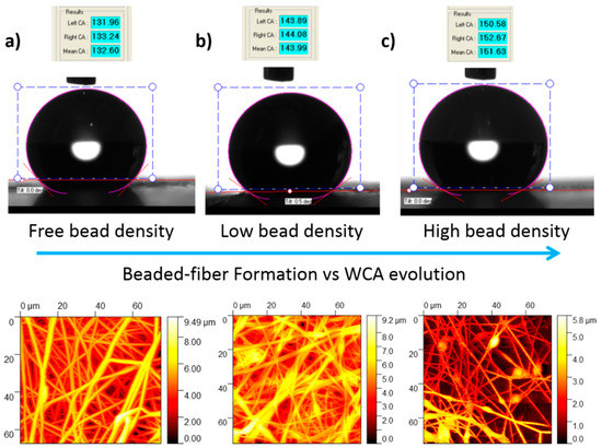 Comparison between the water contact angle images recorded for the PVC electrospun fiber mats with their corresponding AFM images for Sample 4 with free bead density (a), Sample 2 with low bead density (b), and Sample 5 with high bead density (c), respectively.
