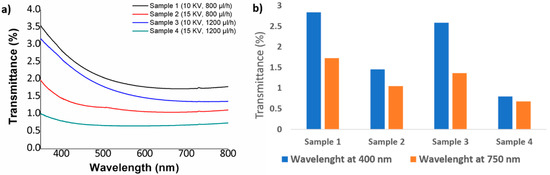 UV–vis spectra of all PVC samples have been also analyzed in the spectral range of 350–800 nm, as it can be appreciated in Figure 6 and Figure 7, respectively. In both Figures is analyzed the effect of a fixed polymeric concentration (10 wt % and 15 wt %) in the resultant transmittance as a function of variable applied voltage and flow rate. According to this, in the Figure 6 is shown the variation of the transmittance for samples with the highest PVC concentration (15 wt %), and the resultant electrospun PVC fibers have shown a low transmittance and poor transparency in the spectral range of study.