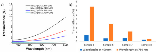 It is worth mentioning that when using a polymeric PVC solution with a low concentration (10 wt %), the electrospun fibers have shown a better transmittance in the spectral range of study (see Figure 7) which is associated to the presence of thinner electrospun fibers in comparison with the fibers obtained by 15 wt % concentration (see Table 2). One aspect to remark is that the same tendency of less transparence is observed when both flow rate or applied voltage are increased. In Figure 7b we can see the evolution from 1.35% to 0.68% at 400 nm and from 7.86% to 3.93% at 700 nm when the flow rate is increased from 800 µL/h (Sample 5) to 1200 µL/h (Sample 6) at a fixed voltage of 10 KV or a change from 0.71% to 0.38% at 400 nm and from 2.2% to 0.52% at 700nm for Sample 7 (800 µL/h) and Sample 8 (1200 µL/h) at a fixed voltage of 15 KV, respectively. In addition, as it has happened for the highest PVC concentration (15 wt %), the effect of increasing the applied voltage from 10 to 15 KV has produced a more significant reduction in the light transmittance of the PVC fibers. More specifically, a change from 1.35% to 0.71% (at 400 nm) and from 7.86% to 2.22% has been observed for Sample 5 (10 KV) and Sample 7 (15 KV) at a fixed flow rate of 800 µL/h or a change from 0.67% to 0.38% (at 400 nm) and from 3.93% to 0.52% for Sample 6 (10 KV) and Sample 8 (15 KV) for a fixed flow rate of 1200 µL/h, respectively. The main conclusion derived from these experimental results are associated to the presence of more air pockets which are trapped between the protrusions on the fiber surface when the flow rate or applied voltage is increased. According to this, these air pockets act as effective pores of the electrospun fiber mats, making a higher scattering of the light possible and as a result, the fiber surface has become more opaque with the corresponding decrease in the optical transmittance in the visible region at 400 nm and 750 nm of the spectral range [56]. It can be concluded as a function of the initial PVC concentration can be manipulated the resultant optical transmittance in the visible region from more opaque (high PVC concentration) up to more transparent (low PVC concentration), although the resultant electrospun fibers show a poor transparency in the visible region. One of the main reasons of this low light transmittance can be derived from the fabrication time of the electrospun fiber coatings and due to this, if the fabrication time is reduced, the fiber surface becomes more transparent. Finally, due to these optical properties of poor transparency, the optical transmittance has not been considered as a representative factor in the design of experiments section.