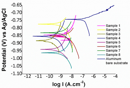 Electrochemical corrosion tests based on Tafel polarization curves were carried out using an Autolab Potentiostat/Galvanostat PGSTAT302 (Metrohm, Herisau, Switzerland). All corrosion tests were conducted at room temperature in 3.5 wt % NaCl by using a conventional three electrode cell system composed of a working electrode (WE, bare or coated aluminum sample), a Ag/AgCl reference electrode (RE), and a platinum counter electrode (CE). It should be noted that before conducting the tests, all the samples of study were exposed in the electrolyte solution for 30 min with the aim to stabilize the open circuit potential (OCP). A linear potential sweep in the anodic direction was conducted at a scan rate of 0.5 mV/s, beginning at 0.15 V below OCP and terminating at 0.15 V above the OCP. The output from these experiments yielded a polarization curve of the current density versus the applied potential. The resulting corrosion current can be calculated by using Tafel slope analysis where it established a relationship between the current density and the electrode potential during the polarization. The corrosion data were obtained from Tafel polarization curves where it was obtained by superimposing a straight line on the linear portions of the cathodic and anodic curves. Finally, other corrosion parameters—such as equivalent weight of the metal, density, or exposed surface—are also required as input parameters. With this information, the software generates the complete set of corrosion parameters. Thus, the corrosion rate is calculated according to