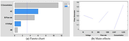 In Figure 9 is shown the Pareto chart obtained when performing a statistical analysis of the results for the fiber diameter. It can be stated that the concentration is the most significant factor followed by the interaction between the voltage and concentration, the flow rate, the voltage and the interaction between the voltage and the flow rate. It is shown that when the concentration is increased, the fiber diameter has been also increased as it has been previously commented. In Figure 9b, it is also shown that the effect of the concentration on the fiber diameter is greater than with voltage and flow rate.