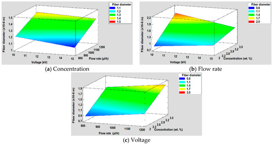 Fiber Diameter = −3.0011 + 0.200838 × Voltage + 0.0001625 × Flow rate + 1.63189 × Concentration + 0.000035 × Voltage × Flow rate − 0.0951586 × Voltage × Concentration